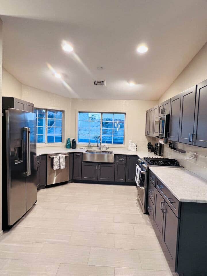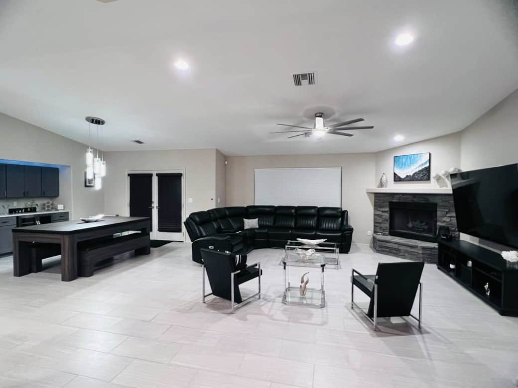 Welcome to this beautiful vacation oasis! This luxury home is an entertainers dream and has fun for the whole family. It boasts 3 large bedrooms and 2 bathrooms with a total of 7 beds (1 king, 2 queens, 1 full, 3 twins). It has a very large open concept living room and dining room area that open into the fully equipped chef’s kitchen. The dining table converts into a pool table and table tennis. The fully furnished backyard hosts plenty of shaded seating with a BBQ, fire pit, a pool, & hot tub!